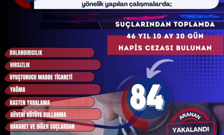 Yakalanan şahıslar arasında, “Hizmet Nedeniyle Güveni Kötüye Kullanma” suçundan 20 yıl 11 ay kesinleşmiş hapis cezası ile “Bina İçinde Muhafaza Altına Alınmış Olan Eşya Hakkında Hırsızlık” suçundan 6 yıl 3 ay kesinleşmiş hapis cezası bulunan iki kişi de yer aldı. Bunun yanı sıra uyuşturucu madde ticareti, dolandırıcılık ve kasten yaralama gibi suçlardan aranan kişiler de emniyet birimleri tarafından yakalandı.